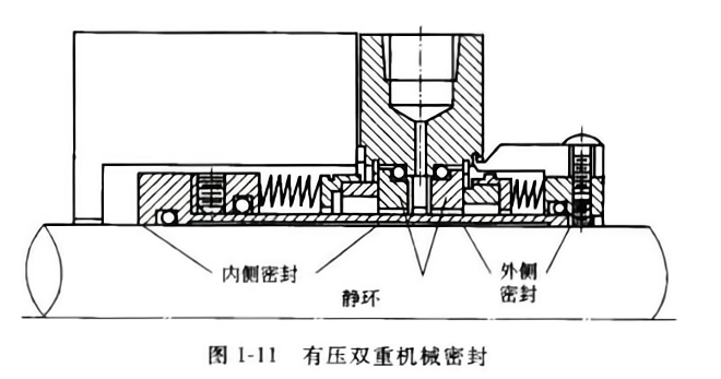 有壓雙端面機(jī)械密封(即Face-to-Face雙端面機(jī)械密封)有兩對摩擦副,結(jié)構(gòu)復(fù)雜,需要外供封液系統(tǒng),密封腔內(nèi)通入比介質(zhì)壓力高(0.5--1.5)x105Pa 的隔離液,起封堵、潤滑等作用。隔離液對內(nèi)側(cè)密封起到潤滑作用。