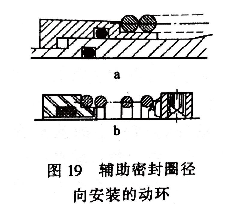 輔助密封圈徑向裝置的動環(huán)(圖19),靠密封圈的過盈和彈性實(shí)現(xiàn)密封,其材質(zhì)大多采用聚四氟乙烯和合成橡膠。伴隨使用時間變長,這兩種材質(zhì)分別呈現(xiàn)冷流變形和老化而失去彈性。有文獻(xiàn)記載,這種結(jié)構(gòu)的密封,有40%的失效發(fā)生在輔助密封圈位置。
