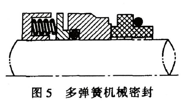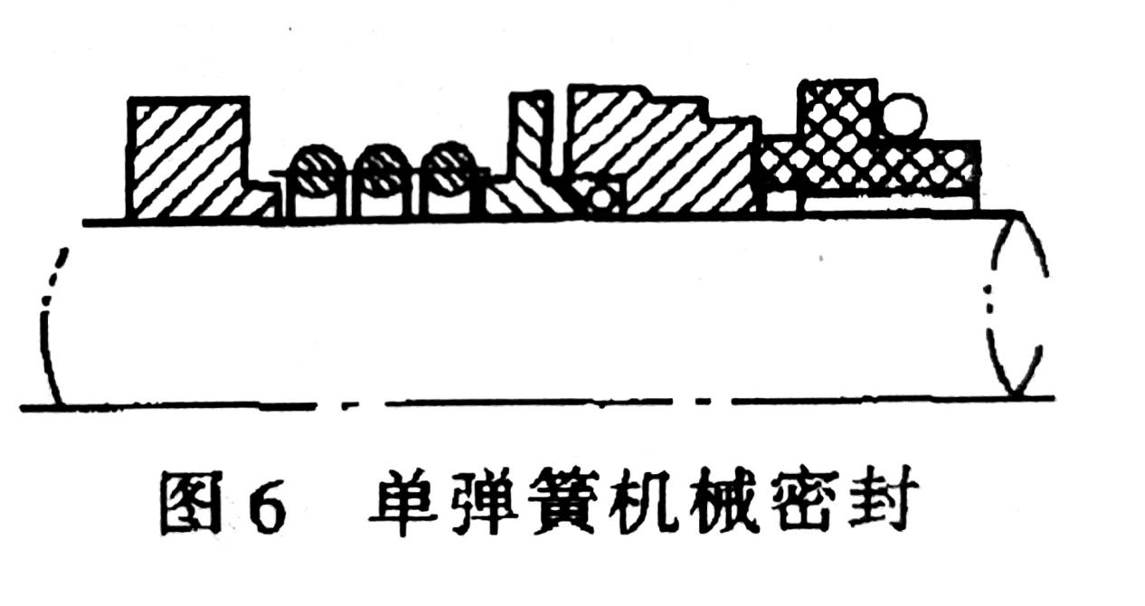 按補(bǔ)償結(jié)構(gòu)中彈簧的數(shù)量可分為多彈簧和單彈簧機(jī)械密封。補(bǔ)償結(jié)構(gòu)中有多個(gè)彈簧的密封稱為多彈簧機(jī)械密封(圖5);補(bǔ)償結(jié)構(gòu)中只有一個(gè)彈簧的機(jī)械密封稱為單彈簧機(jī)械密封(圖6)。多彈簧機(jī)械密封又稱小彈簧機(jī)械密封,這種結(jié)構(gòu)軸向長(zhǎng)度較小,可用更改彈簧數(shù)量的辦法調(diào)節(jié)彈性力大小,軸向力較均勻,適用于高速機(jī)械密封,在腐蝕性介質(zhì)中不宜采用。單彈簧機(jī)械密封又稱大彈簧機(jī)械密封,密封結(jié)構(gòu)較為簡(jiǎn)單。有的密封型式還用彈簧傳遞扭矩。國(guó)產(chǎn)密封應(yīng)用大彈簧較多,但不能用于高速。