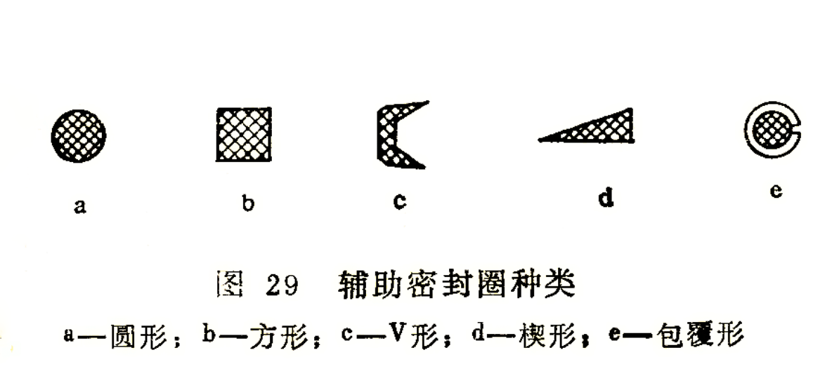 動環(huán)和軸(軸套)以及靜環(huán)和壓蓋之間的密封靠輔助密封圈來實現(xiàn)。它們基本上歸于靜密封,當密封端面和軸中心線不垂直時,動環(huán)密封圈沿軸向有很小的運動位移,其移動量取決于密封端面和軸中心的垂直度誤差、運動的次數(shù)和軸轉(zhuǎn)速等。輔助密封圈的種類有很多,從材質(zhì)角度分類有合成橡膠、聚四氟乙烯和柔性石墨等;從斷面形狀分類有圓形、方形、V形、楔形及包覆形密封圈(圖29)。