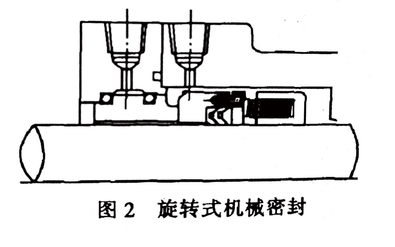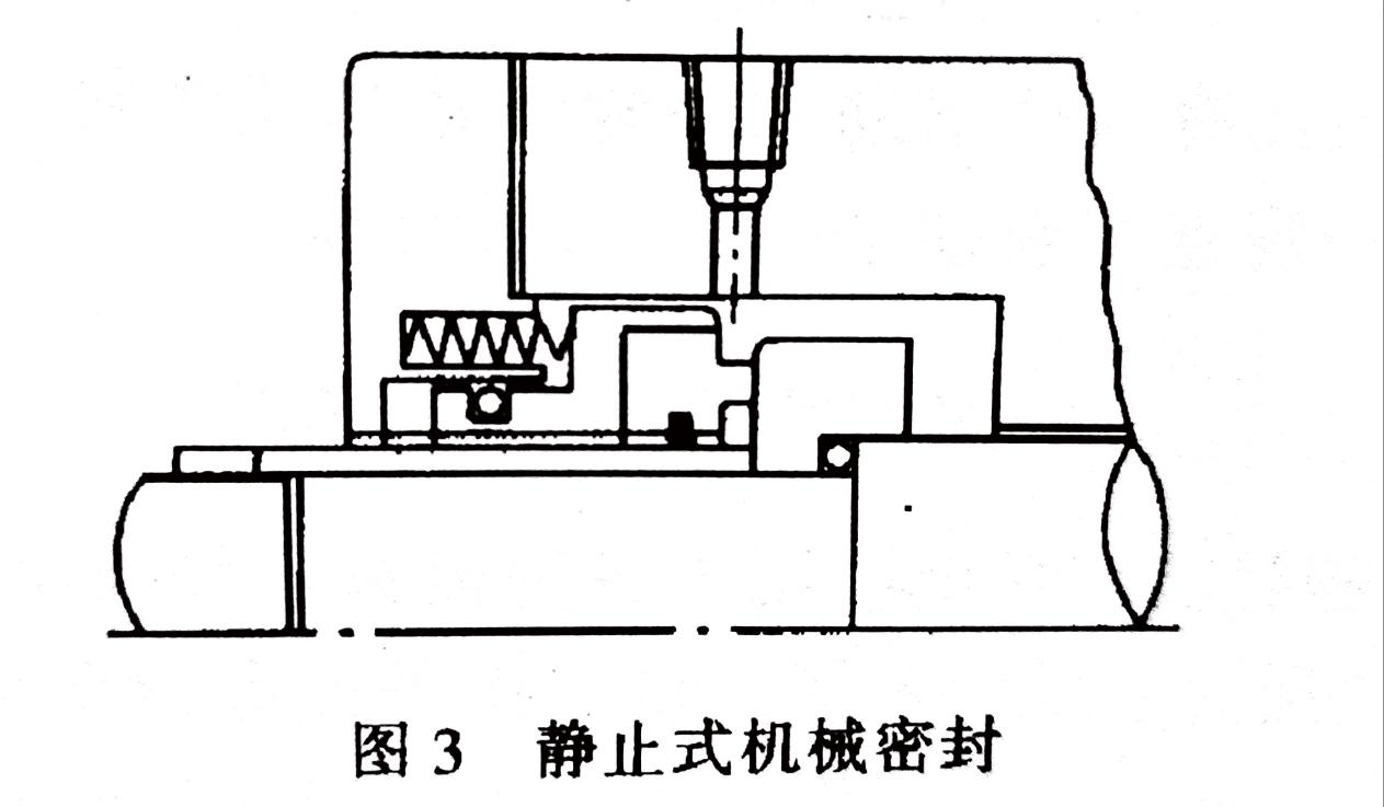 按補償結構彈性元件的運動情況,可以分為旋轉式和靜止式機械密封。補償結構隨軸旋轉的稱為旋轉式機械密封(圖2);補償結構不旋轉的(安裝在壓蓋內)稱為靜止式機械密封(圖3)。補償結構旋轉時易發(fā)生質量不平衡,同時消耗攪拌功率,因此,旋轉式密封不能用于高速;而靜止式密封可用于高速??墒切D式密封安裝較方便,所以,普通的機械密封大多選用旋轉式結構。
