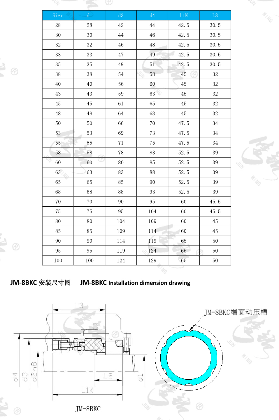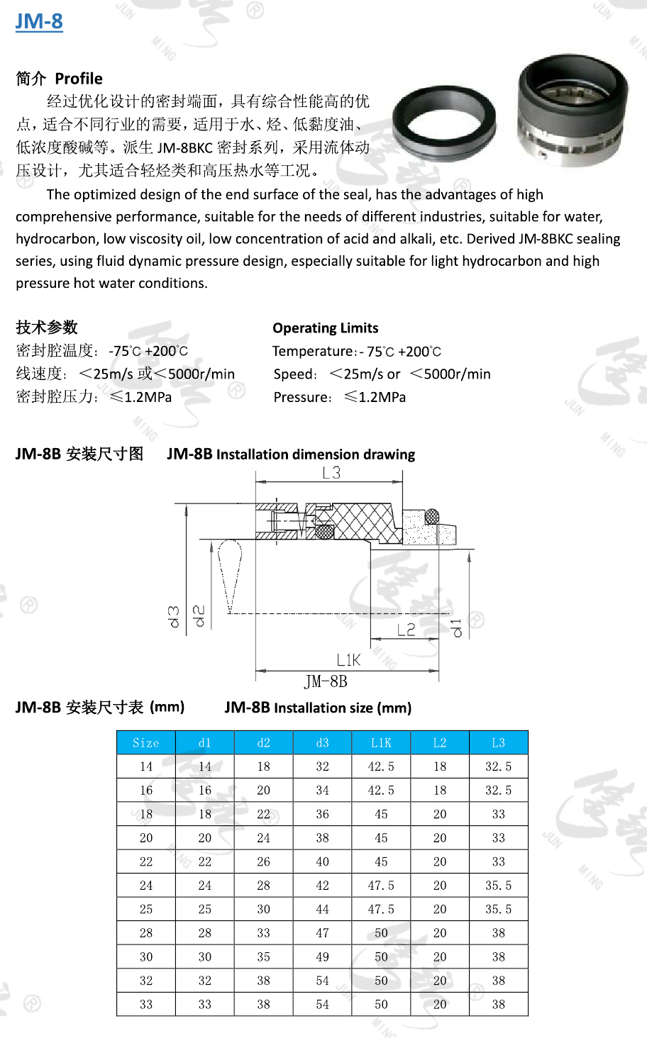 經(jīng)過(guò)優(yōu)化設(shè)計(jì)的密封端面,具有綜合性能高的優(yōu)點(diǎn),適合不同行業(yè)的需要,適用于水、烴、低黏度油、低濃度酸堿等。派生JM-8BKC密封系列,采用流體動(dòng)壓設(shè)計(jì),尤其適合輕烴類(lèi)和高壓熱水等工況。