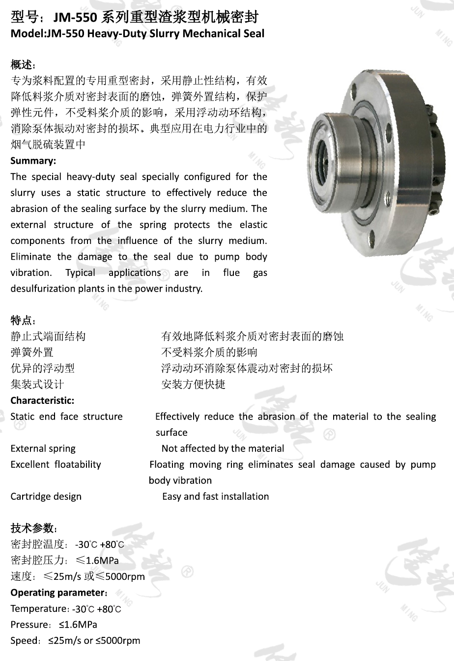 專為漿料配置的專用重型密封,采用靜止性結(jié)構(gòu),有效降低料漿介質(zhì)對密封表面的磨蝕,彈簧外置結(jié)構(gòu),保護彈性元件,不受料槳介質(zhì)的影響,采用浮動動環(huán)結(jié)構(gòu),消除泵體振動對密封的損壞。典型應(yīng)用在電力行業(yè)中的煙氣脫硫裝置中