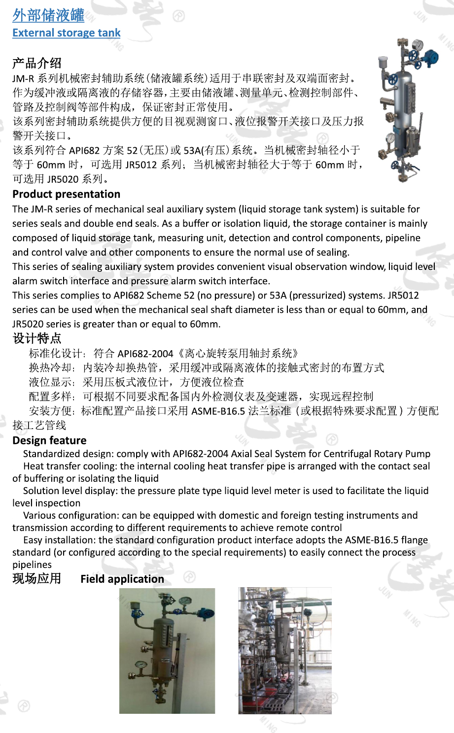JM-R系列機(jī)械密封輔助系統(tǒng)(儲(chǔ)液罐系統(tǒng))適用于串聯(lián)密封及雙端面密封。作為緩沖液或隔離液的存儲(chǔ)容器,主要由儲(chǔ)液罐、測(cè)量單元、檢測(cè)控制部件、管路及控制閥等部件構(gòu)成,保證密封正常使用。