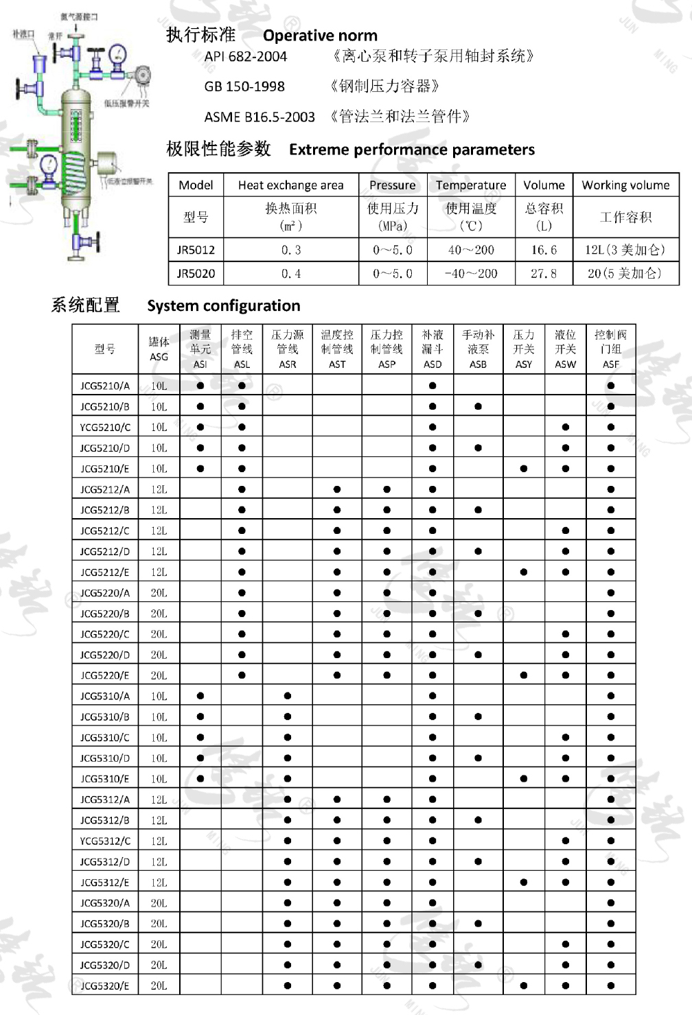 該系列符合API682方案52(無(wú)壓)或53A(有壓)系統(tǒng)。當(dāng)機(jī)械密封軸徑小于等于60mm時(shí),可選用JR5012系列;當(dāng)機(jī)械密封軸徑大于等于60mm時(shí),可選用JR5020系列。