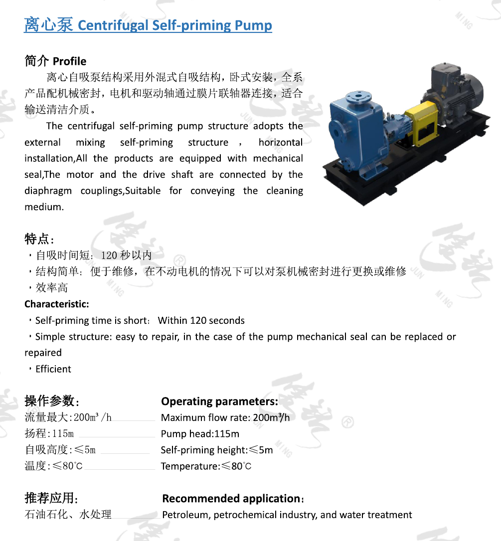 離心自吸泵結(jié)構(gòu)采用外混式自吸結(jié)構(gòu),臥式安裝,全系產(chǎn)品配機(jī)械密封,電機(jī)和驅(qū)動(dòng)軸通過(guò)膜片聯(lián)軸器連接,適合輸送清潔介質(zhì)。